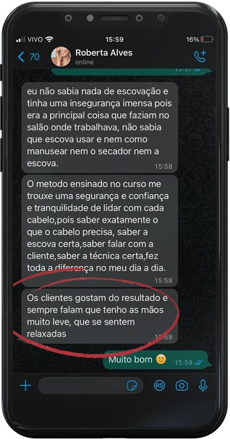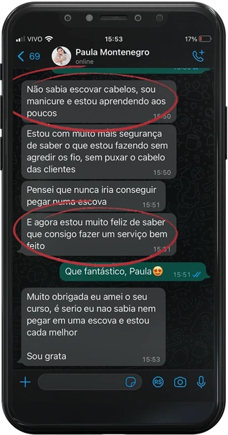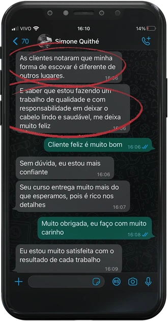 No início da página tem o depoimento da Jane, 25 anos trabalhando no salão e tinha a maior dificuldade em fazer uma escova modelada. Depois que aplicou o conhecimento da Escovista Soberana, passou a receber elogios das clientes, e lotou a agenda. Vale a pena voltar no topo da página e assistir o vídeo do depoimento dela.